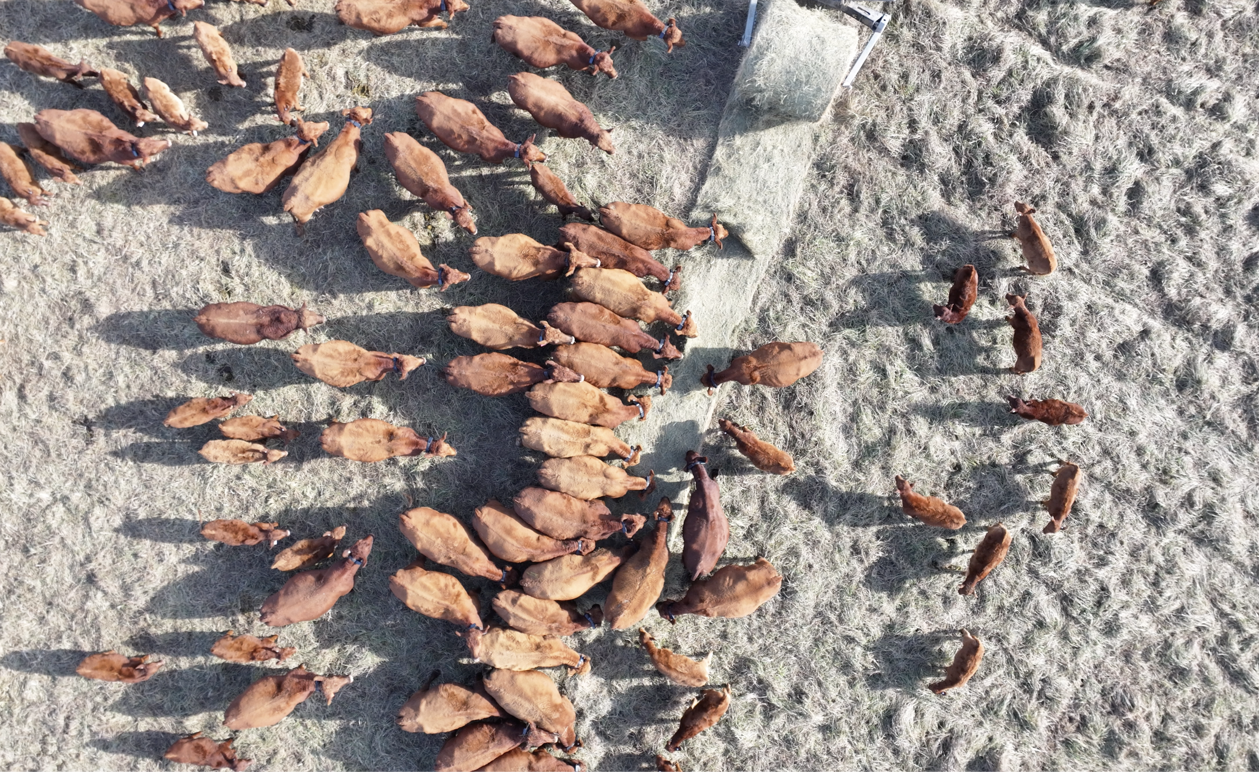 The feeding of mostly round bales & baleage on the land is variable. Farms use a pre-placed stationary grid-like pattern with around 2-4 tons of bales/acre. They use bale unrollers and free gravity to spread hay and nutrients out. Some use movable rings or wagons to reduce feed waste. Most farms use a combination of these tools, including heavy use areas, to feed in differing weather conditions. Bale grazing is not just for winter impact, it can be used during droughts or wherever a grazing impact is warranted to improve land by grazing animals.